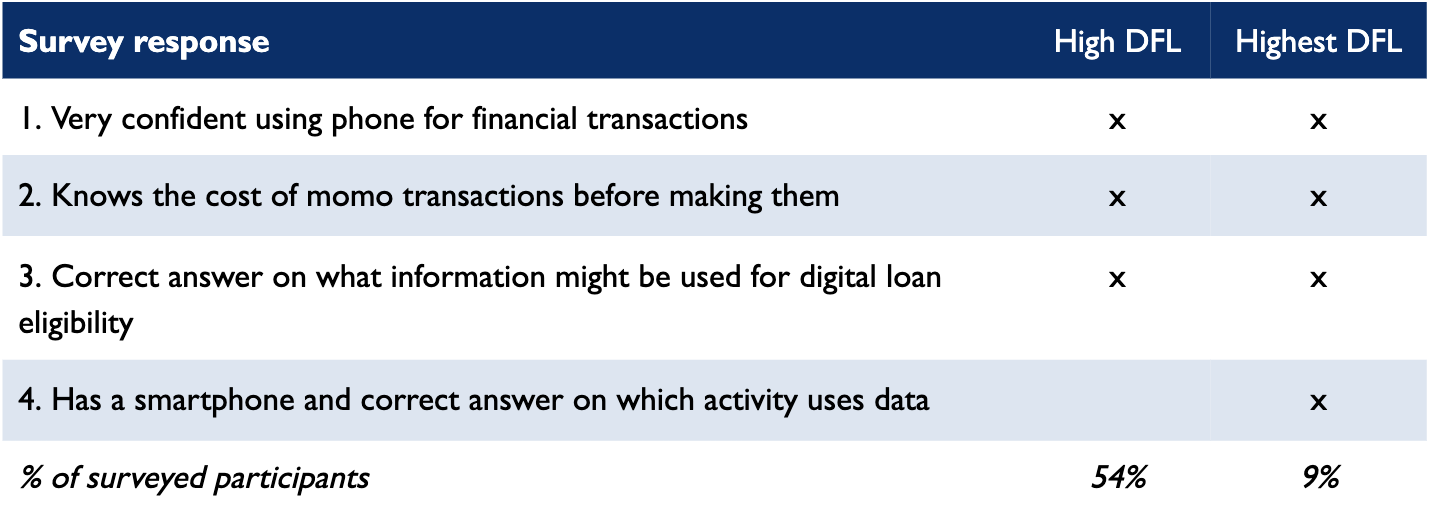 The highest DFL group did start with higher digital financial exposure than average — all started as “very confident” and had used mobile money before. Still, their DFL notably grew during the program; none met the high DFL level in a survey conducted just three months before the endline (and none owned a smartphone). At that time, the average number of episodes heard was 15; by the end, all had heard all 25 episodes of Hey Sister.